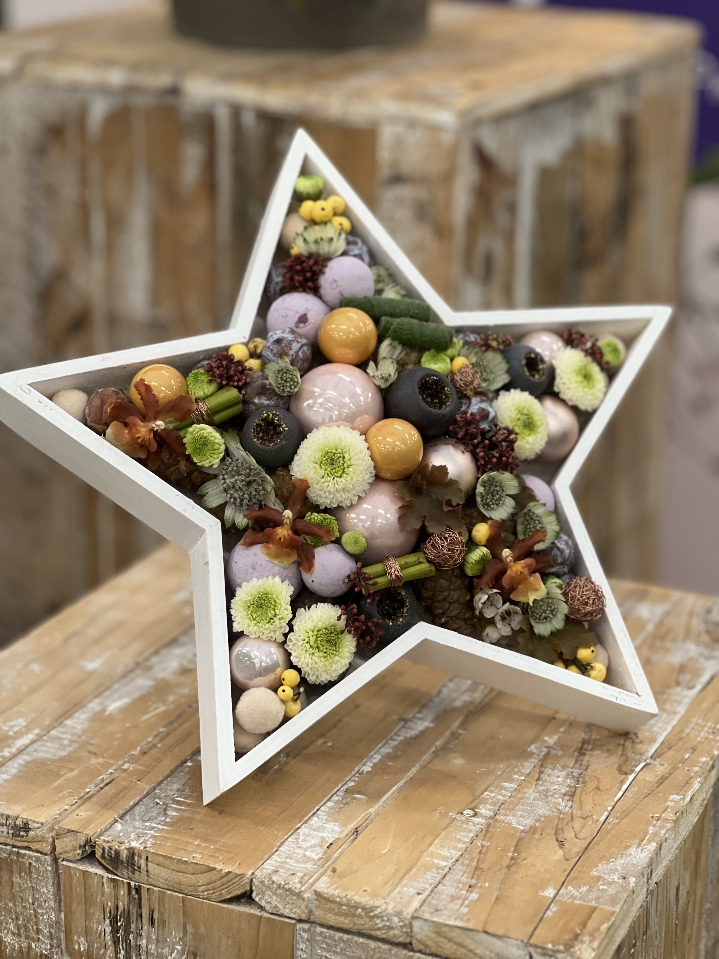 Egy különleges, fa alapra készített, csillag alakú csokor, vagy dísz, mely a felhasznált kiegészítőknek és anyagoknak köszönhetően az egész szezonban díszítheti az otthonodat.