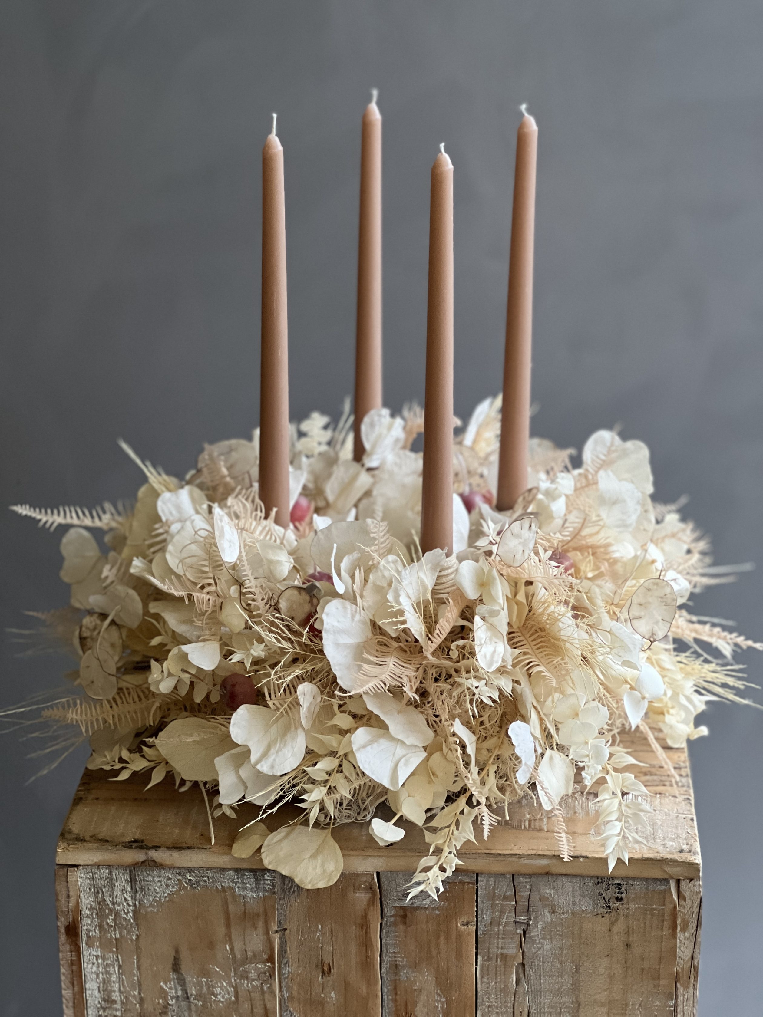 Egy nagyon különleges koszorút alkottunk, melyhez preparált növényi részeket használtunk. Eucalyptusok, páfrány és más növények apró leveleiből áll ez az alkotás, amely biztos, hogy az idei év egyik legkedveltebb adventi koszorúja lesz majd.